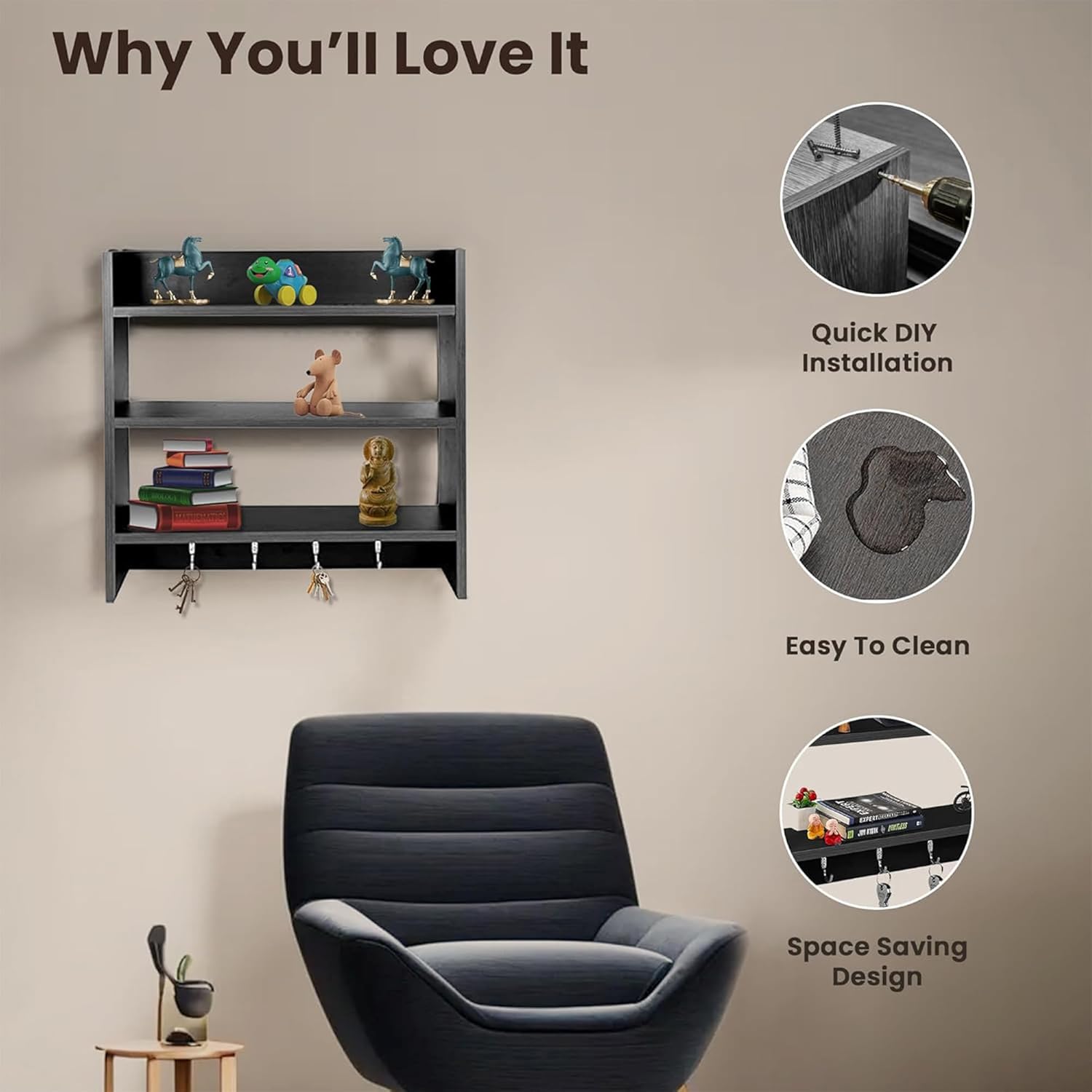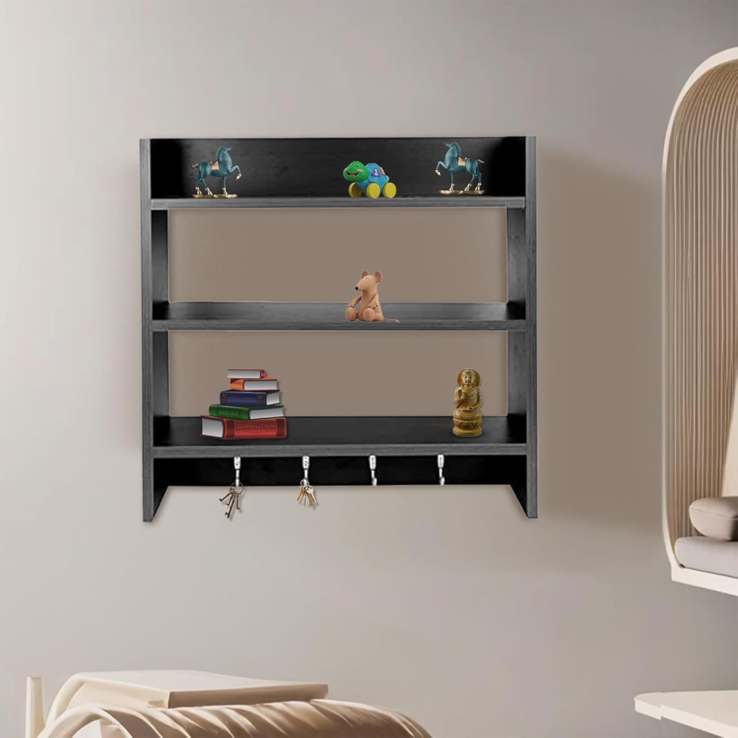 Wudlix Material Engineered Wood Mounting Type Wall Mount Room Type Living Room Shelf Type Single Wall Shelf Number of Shelves 1 Shape Rectangular Style Grey Finish Type Painted Brand Kuber Industries Size 1Durable Wooden Rack Storage with Hook Wall Mount Wooden Wall Shelf for Bedroom & Living Room | Furniture Wall Rack Shelf for Decor | Grey